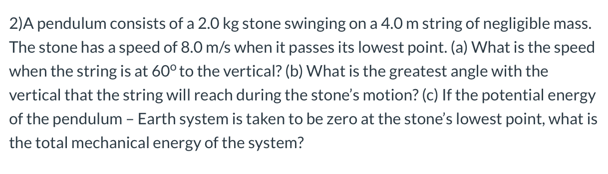 A Pendulum Consists Of A 2 0 Kg Stone Swinging On A 4 5 M String Of Negligible Mass The Stone Has A Speed Of 8 0 M S When It Passes Its Lowest Point A